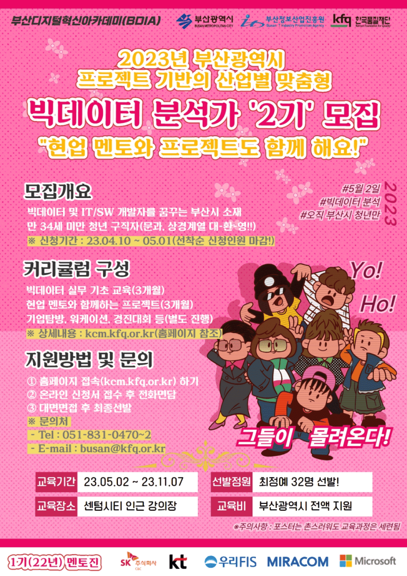 전공자 비전공자 구분없이 빅데이터 분야에 취업을 희망하는 학생을 대상으로 이론교육부터, 미니프로젝트, 취업지원까지 한번에 지원받자