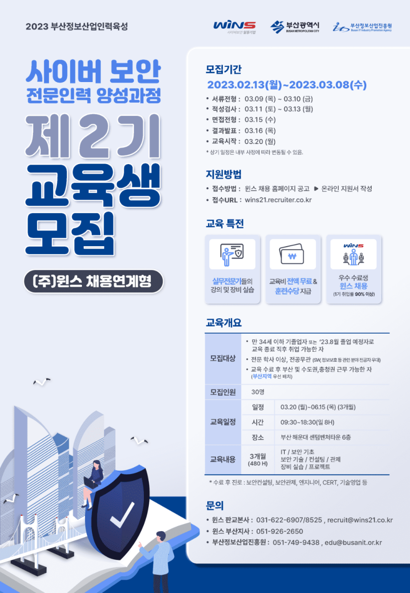 3개월동안 실무전문가들의 강의 및 장비슬습을 통해 IT/보안 기초/ 보안기술/ 컨설팅/ 관제 / 장비실습 / 프로젝트를 전액 무료로 배울 수 있는 기회