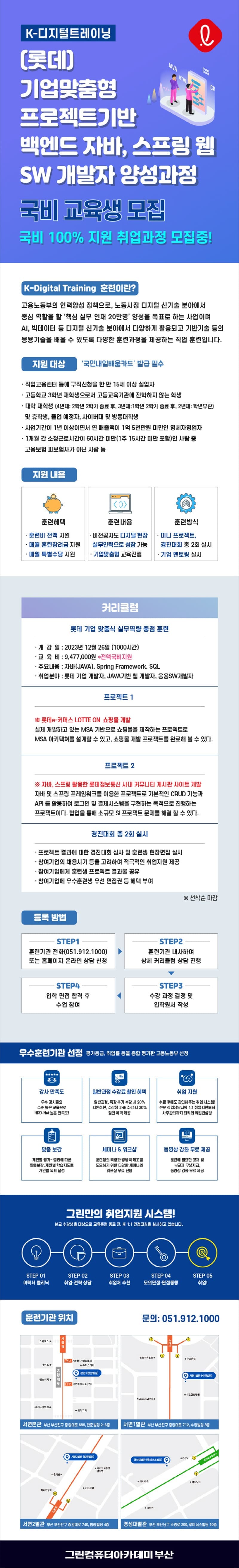 K-Digital Training / 프론트, 백엔드 개발자 / 롯데 기업 맞춤식 실무역량 훈련문의 : 051-912-1000