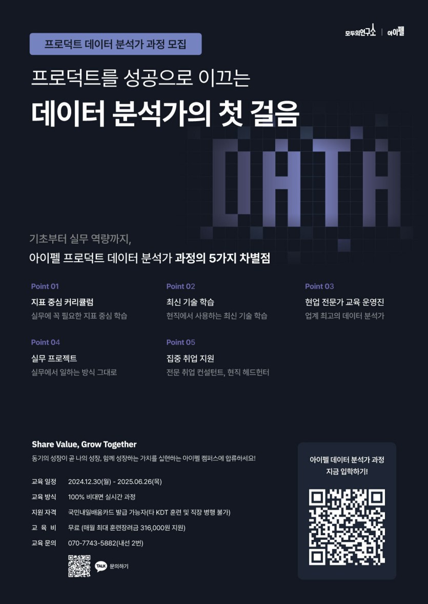 온라인 교육 / 지표 중심 커리큘럼, 현업 전문가 교육 운영진, 집중 취업 지원 / 교육비 무료 및 매월 훈련장려금 지원