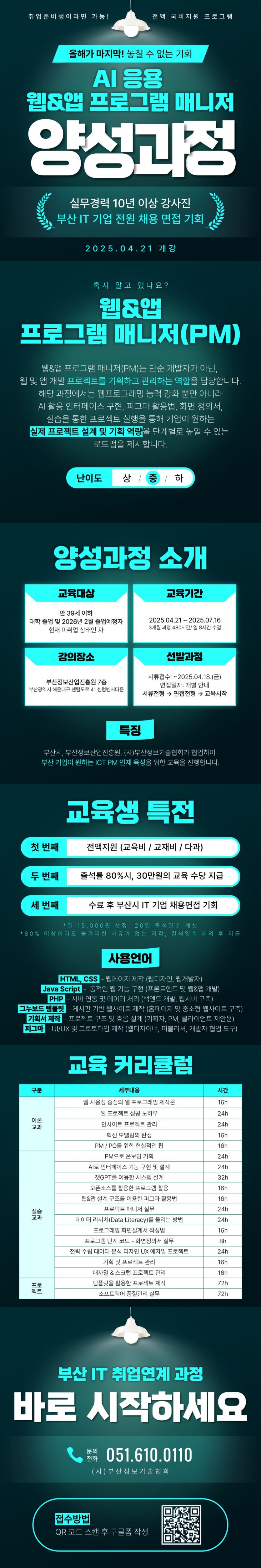 #웹&앱 PM(중급자) 양성 #이론, 실무, 프로젝트 교과 #채용연계형 교육과정 #훈련수당 지급 (문의 : 051-610-0110)
