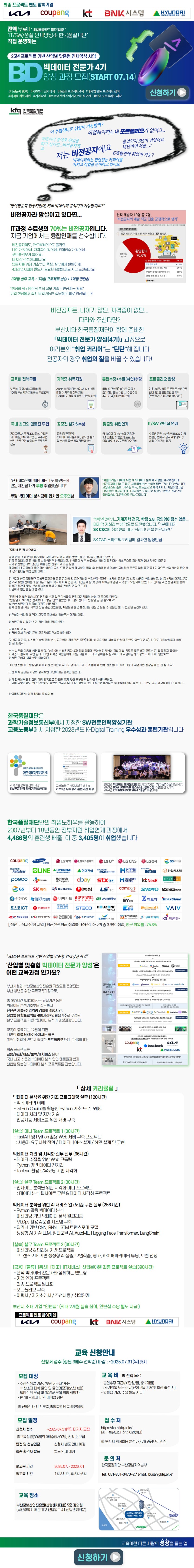 ? 과정 개요교육명: 빅데이터 전문가 양성과정 (4기)개강일: 2025년 7월 14일(월)교육기간: 2025.07.14 ~ 2026.01.16 (총 6개월)
