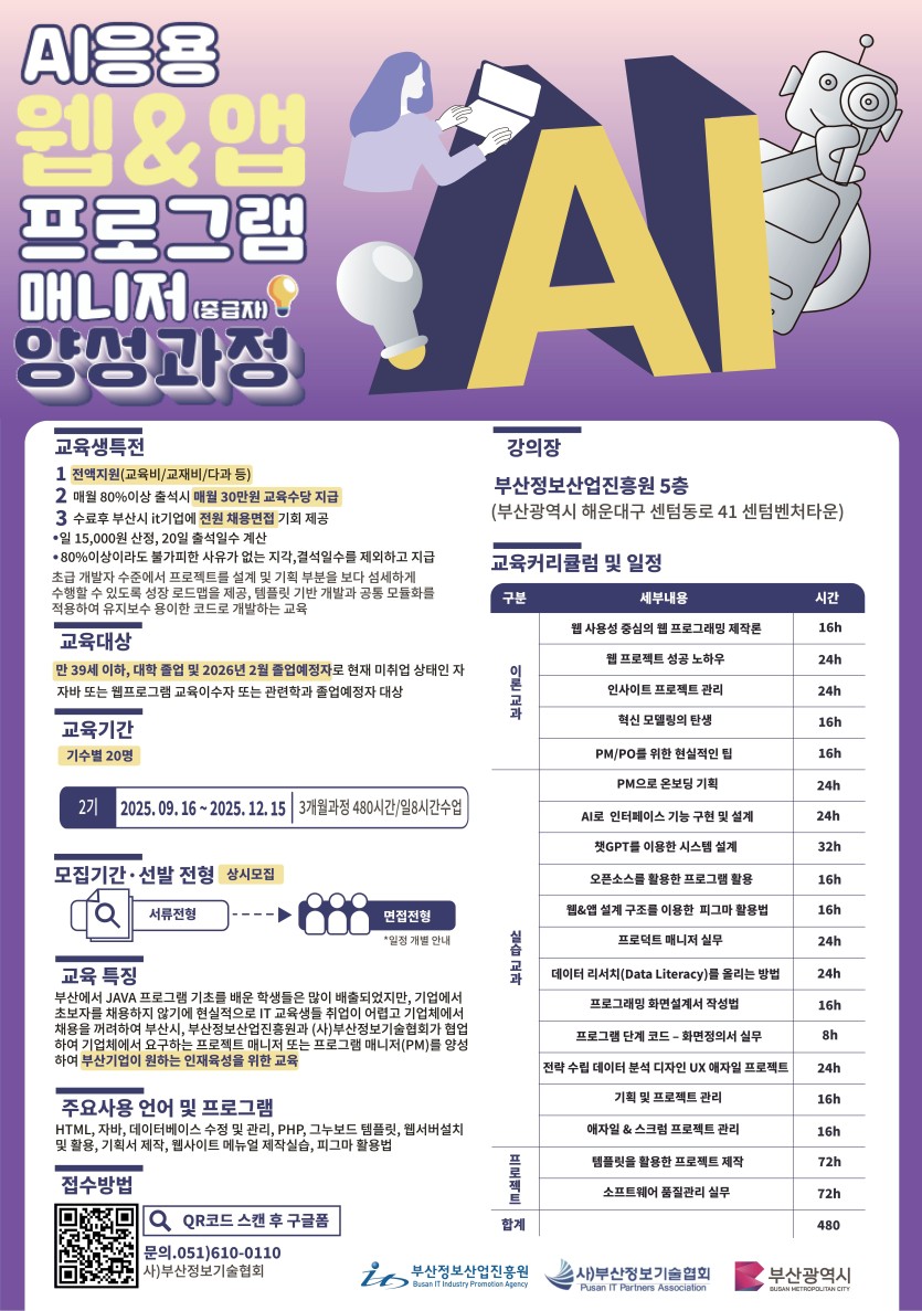 #웹&앱 PM(중급자) 양성 #이론, 실무, 프로젝트 교과 #채용연계형 교육과정 #훈련수당 지급 (문의 : 051-610-0110)