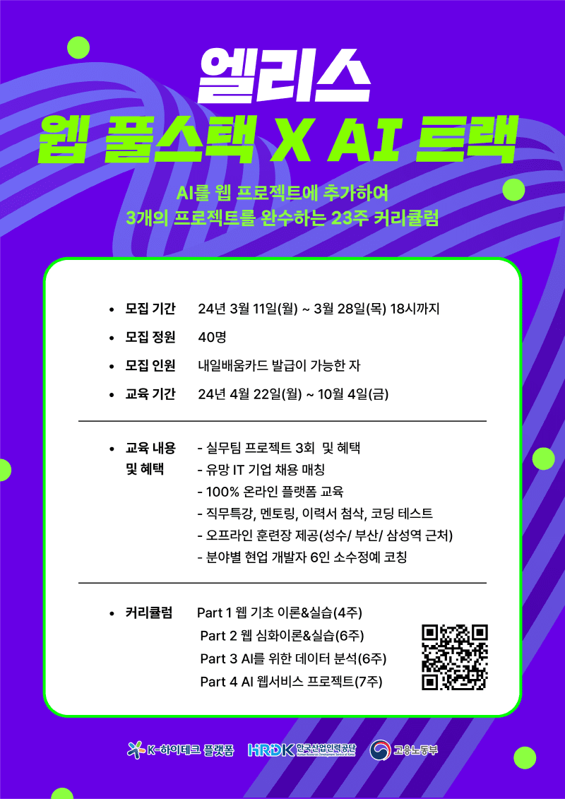 엘리스가 운영하는 '엘리스 웹 풀스택 X AI 트랙'에 참여할 교육생을 모집하오니, 많은 참여 부탁드립니다.