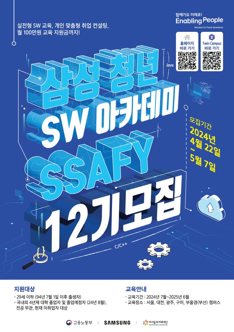 삼성 청년 SW 아카데미(SSAFY)가 운영하는 '삼성 청년 SW 아카데미 12기 모집'에 참여할 교육생을 모집하오니,
