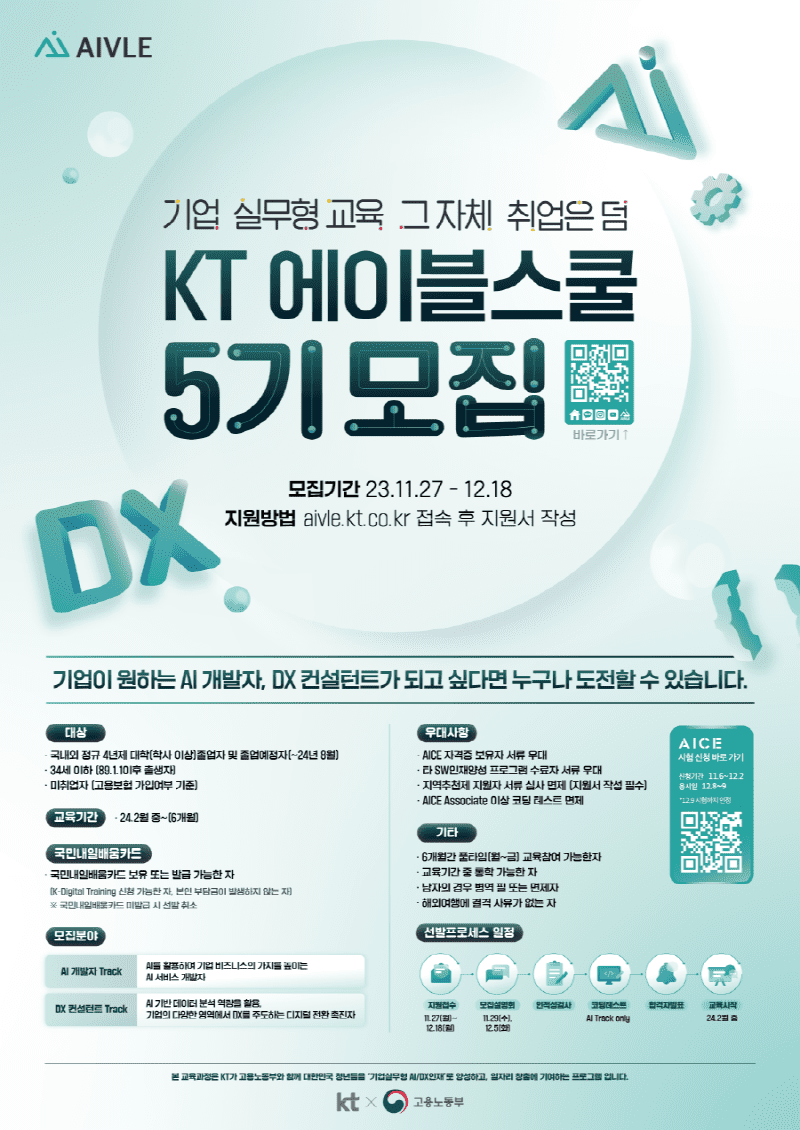 KT가 운영하는 'KT 에이블스쿨 5기'에 참여할 교육생을 모집하오니, 많은 참여 부탁드립니다.