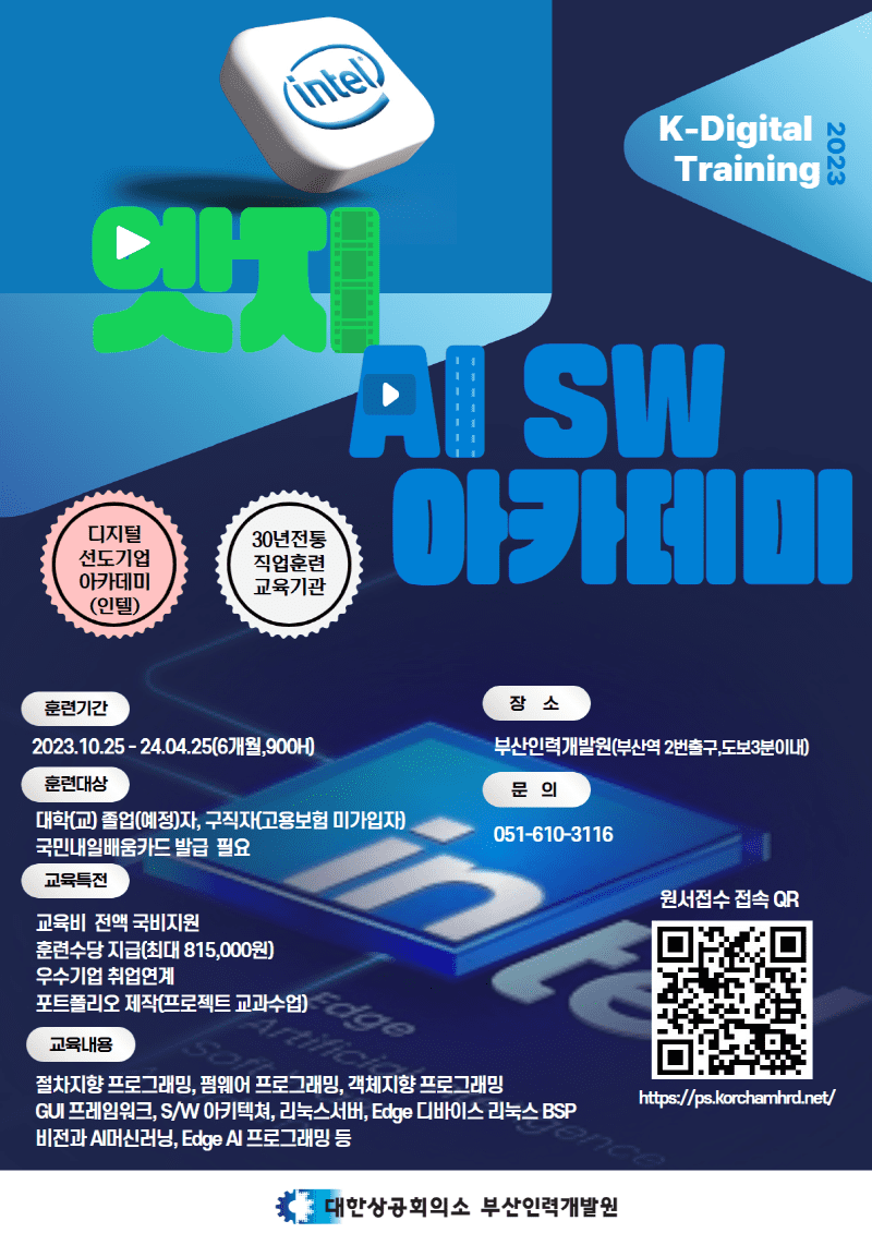 부산인력개발원이 운영하는 <[Intel] 엣지 AI SW 아카데미>에 참여할 교육생을 모집하오니, 많은 참여 부탁드립니다.