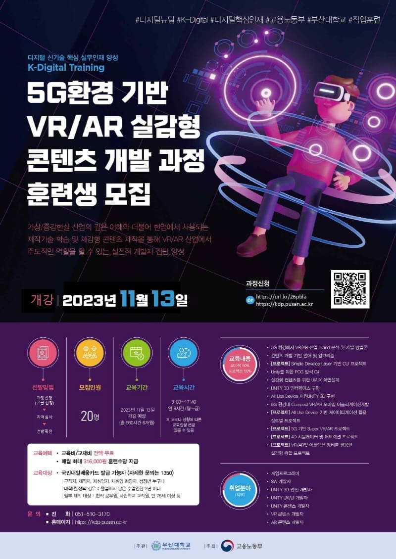 부산대학교가 운영하는 <5G환경 기반 VR/AR 실감형 콘텐츠 개발 과정>에 참여할 교육생을 모집하오니, 많은 참여 부탁드립니다.